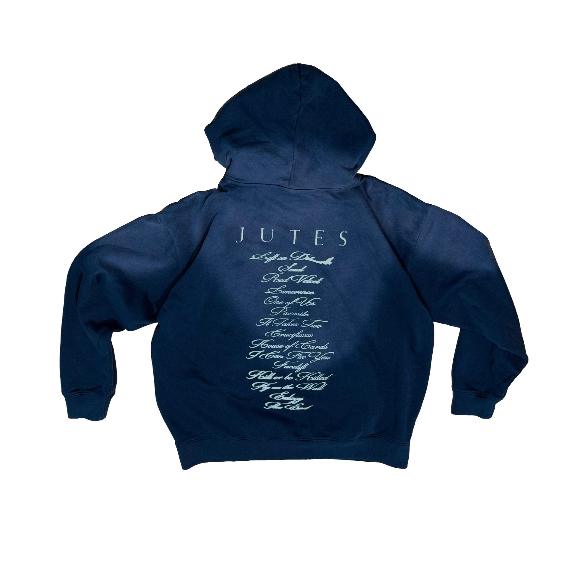 Blue vintage washed, faded and distressed pullover hoodie. Album cover graphic on the front and track list on the back.