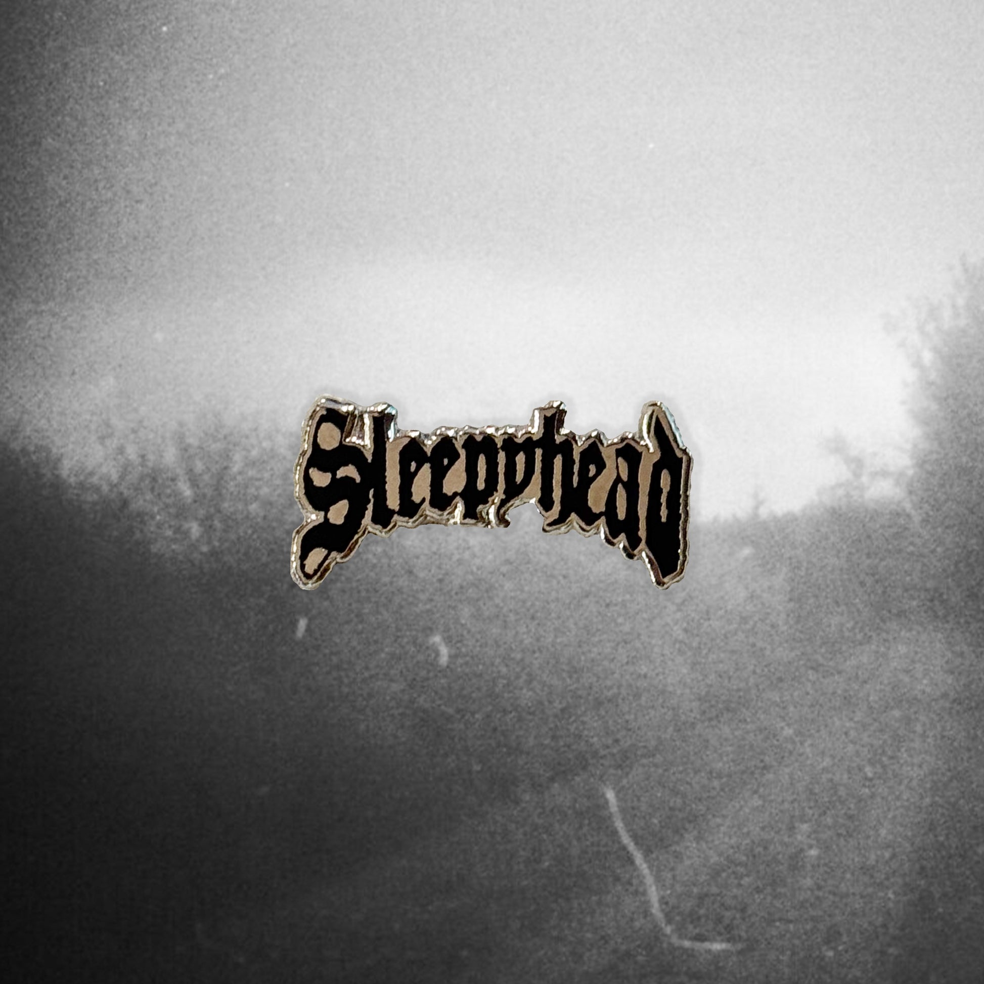 Shiny silver & black colored Sleepyhead pin. 1.25 inch wide.